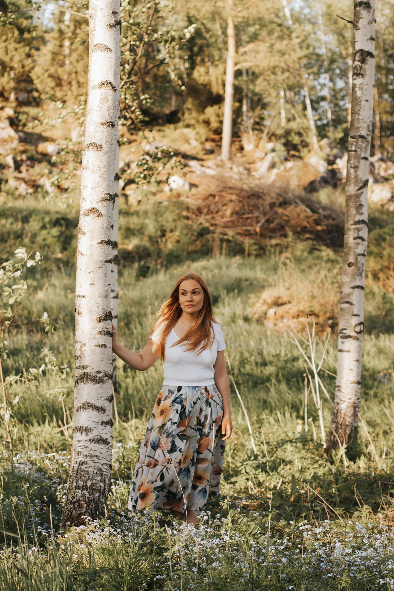 Kesäillan potrettikuvaus upeasta sinusta omenapuiden kukkiessa. Valokuvaaja Mira Koskinen, MiraKoo. Kokemäki Satakunta, valokuvaan ympäri Suomen.
